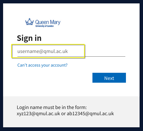 Clicking continue will redirect you to the QMUL login page. Use your university login credentials.
