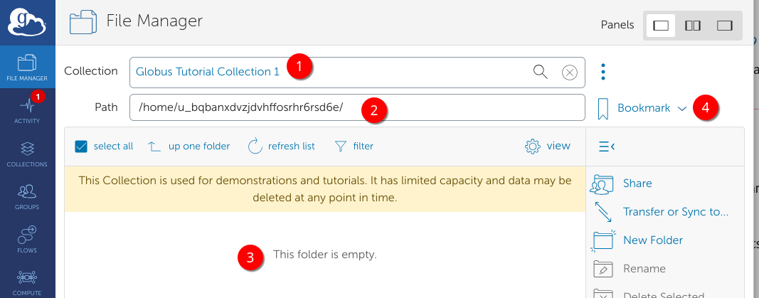 Globus will connect to the collection and display the default directory (it will be empty).