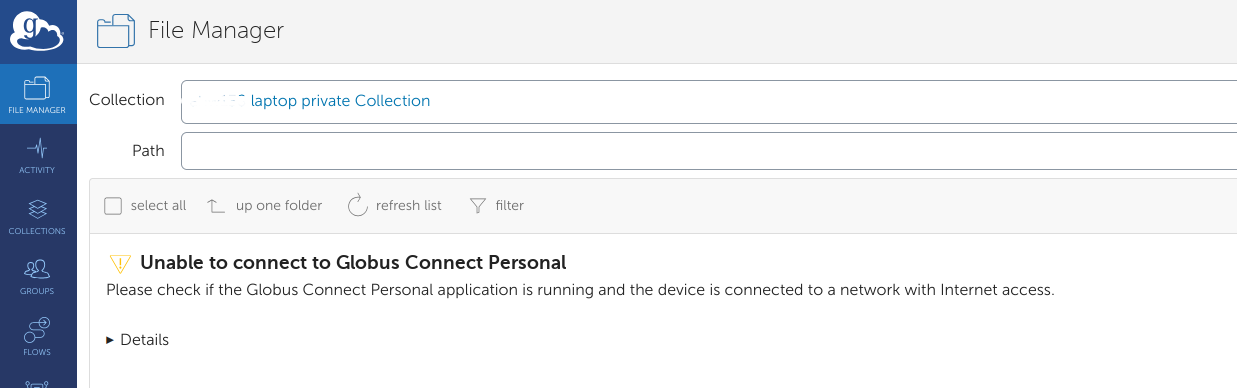 If Globus Connect Personal is not connected, you will see an error similar to this when trying to access the collection: