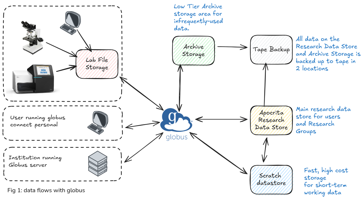 The low-tier archive storage is a high capacity storage designed to store data which is infrequently used but needs to be stored safely and sustainably, for occasional access. By providing this on tape media we are able to provide this at much lower cost than disk-based storage. The trade-off is that recalling the data from tape is not instantaneous, but depending on the quantity of data recalled, there will be a waiting period to make the files available, hence the low tier description, describing the latency to access the files. This recall action can be initiated by the end-user/data owner, via the Globus file transfer service.