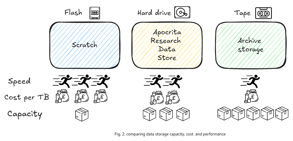 Each data store has different qualities depending on its purpose. You can read more about when to use each one in more detail on the HPC documentation site.